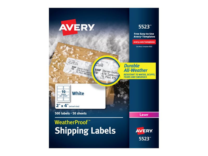 Avery weatherproof labels canada. Avery Full Sheet Printable Shipping Labels, 8.5" x 11", Matte ... Jun 01, 2009 · Labels and packaging are made of 100% recycled material and are processed chlorine-free. Premium materials and textures and an elegant touch to envelopes and gifts. When you only need a few labels, print just a few rather than an entire sheet. Scratch- and water-resistant labels specially designed for use with select label printers. Amazon.com: Avery File Folder Labels, Laser and Inkjet ... Jul 07, 2004 · Avery File Folder Labels on 4" x 6" Sheet, Easy Peel, White/Blue, Print & Handwrite, 2/3" x 3-7/16", 252 Labels (5200) HOSSIAN File Folder Labels Name Filing Envelopes Label Stickers, 0.6 x 1.57 in, Small Label Nametags for Jars, Bottles, Food Containers, File Folders, Pack of 150 Amazon.com : Avery File Folder Labels on 4" x 6" Sheets, Easy ... Oct 14, 2005 · Produce labels quickly by writing on the tab folder labels by hand or use the free templates and designs available on the Avery site for a more polished finish. Adjust your laser or inkjet printer to fit the smaller 4” x 6” sheets and print at home with ease. Avery Weatherproof Laser Shipping Labels, 2" x 4", 500/Pack ... Jan 19, 2006 · I bought these to label bottles for water quality samples. Right now I use the Avery 2" x 4" shipping labels that are not weatherproof. They work well but we have to tape them to make them waterproof. We use two 2" x 6" tape strips to completely cover the label. This is an added expense and requires more time to prepare the bottles for sampling.